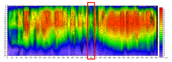 A total of 8 survey lines were designed for this survey, and the distance between No. 1-4 survey lines was 1 meter. The distance of No.5 survey line is 1.5m; The distance of No.6 survey line is 2m; The distance between No.7-8 survey line points is 1.5m. A total of 98 measuring points were measured by No. 1 survey line. No. 2 survey line measures 7 survey points in total; 43 measurement points were measured by No.3 survey line. A total of 29 measuring points were measured by No.4 survey line. No. 5 survey line measures a total of 27 survey points, No. 6 survey line measures a total of 16 survey points; A total of 31 measuring points were measured by No.7 survey line. Survey line 8 measures 10 survey points in total.